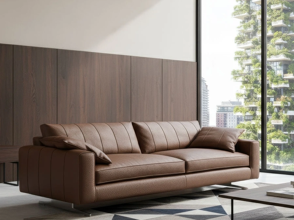 Anima solida, soffice imbottitura e doti di fascino caratterizzano il modello di Divano Stripe Pelle di Cava Divani in pelle presente in foto.